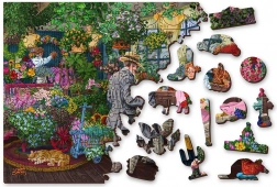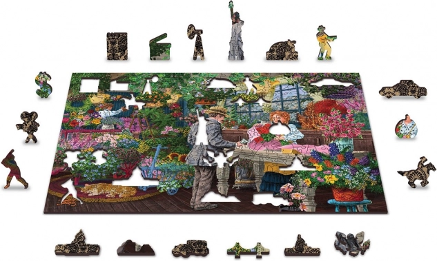 Štýlové drevené puzzle s motívom živého kvetinárstva poteší milovníkov detailných ilustrácií aj náročnejšej skladačky. Vďaka obojstrannému prevedeniu si užijete dve skladačky v jednej – líc s farebnou scénou plnou kvetov a rub so vzorom na skladanie podľa tvarov. Unikátne výseky v tvare zvierat, postáv a predmetov fungujú ako malé figúrky a dodajú skladaniu nový rozmer.
