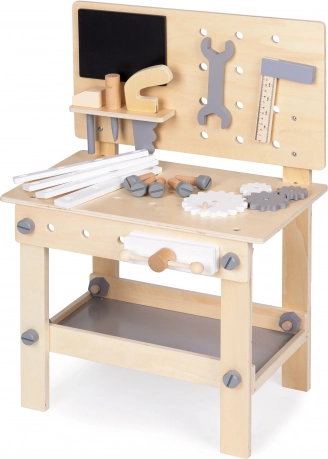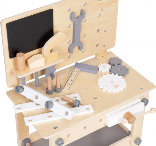 Súčasťou je funkčný zverák a poháňané ozubené kolieska, ktoré deti naučia základné princípy prevodov. Nástroje aj doplnky sú celodrevené, hladké a natreté bezpečnými farbami. Horný panel s otvormi poslúži na prehľadnú organizáciu náradia, k dispozícii je aj kriedová tabuľka na poznámky a náčrty.