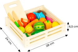 - Box, krájacia doska, 2× nôž (imitácia), škrabka (imitácia), rôzne kusy ovocia a zeleniny