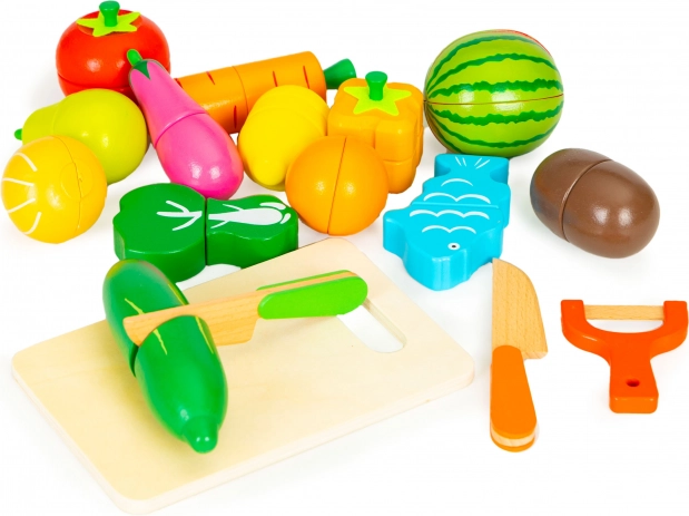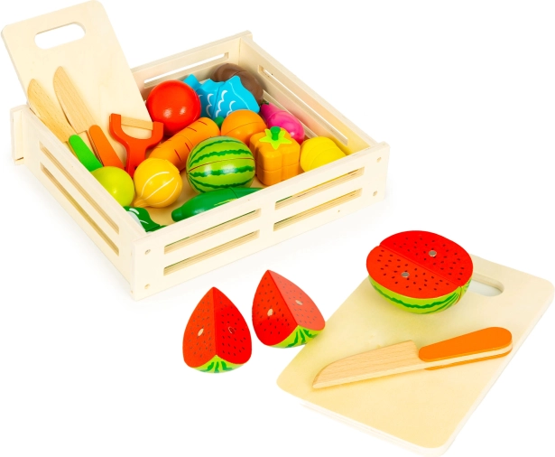 Zábavná sada do detskej kuchynky: 17 dielov drevenej zeleniny a ovocia s možnosťou krájania a opätovného spojenia vďaka magnetom. Súčasťou je krájacia doska, 2 nože a škrabka v praktickom úložnom boxe. Ideálne od 3 rokov na rozvoj jemnej motoriky, kreativity a spoznávania potravín.