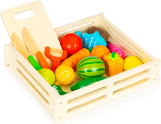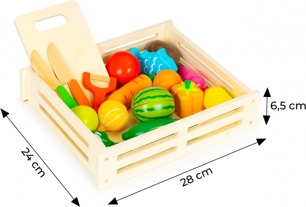 Drevená zelenina a ovocie na krájanie v boxe, 17 dielov