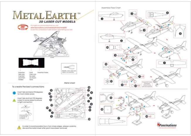 Jednotlivé diely vyberte z kovových plátkov, v prípade potreby použite malé štípacie nožnice (nie sú súčasťou). Dieliky sa spájajú pomocou zámkov tvorených úchytom (zobáčikom) a otvorom. Zobáčik ohnite pomocou malých tenkých klieští (nie sú súčasťou) a postupne spojte všetky zámky, až vznikne veľmi realistický majstrovský kúsok!