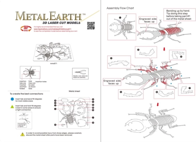 Jednotlivé diely vyberte z kovových plieškov, v prípade potreby použite malé štiepacie nožnice (nie sú súčasťou). Dieliky sa spájajú pomocou zámkov tvorených úchytom (zobáčikom) a otvorom. Zobáčik ohnite pomocou malých tenkých klieští (nie sú súčasťou) a postupne spojte všetky zámky, až vznikne veľmi realistický majstrovský kúsok!