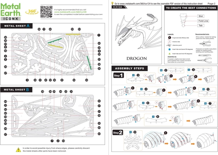 Vzrušujúca výzva, zážitok pri skladaní a oslnivý výsledok – to sú modely METAL EARTH! Model z prémiovej rady ICONX Game of Thrones vás očarí ešte dokonalejším spracovaním detailov! Stavba 3D puzzle METAL EARTH ICONX si vyžaduje trpezlivosť a šikovné ruky. Výsledok práce však plne vyváži vynaložené úsilie! Miniatúrne repliky sú obzvlášť pôsobivou a pútavou dekoráciou nielen doma, ale aj v kancelárii či v škole. Z obdĺžnikových plátkov ocele (21 x 11 cm) s časťami svetových monumentov, slávnych dopravných prostriedkov, hudobných nástrojov či zvierat vám pod rukami vyrastú detailne prepracované, fascinujúce modely. Autentický vzhľad 3D puzzle METAL EARTH ICONX je dosiahnutý vďaka detailnému laserovému gravírovaniu. Balenie obsahuje 2 oceľové plátky a návod na zloženie. Náradie nie je súčasťou balenia. PRACOVNÝ POSTUP: Jednotlivé diely vyberte z kovových plátkov, v prípade potreby použite malé štípacie nožnice (nie sú súčasťou). Dieliky sa spájajú pomocou zámkov tvorených úchytom (zobáčikom) a otvorom. Zobáčik ohnite pomocou malých tenkých klieští (nie sú súčasťou) a postupne spojte všetky zámky, až vznikne veľmi realistické majstrovské dielo! Odporúčaný vek: od 14 rokov. Rozmer zloženého puzzle cca 21 x 19 x 4 cm