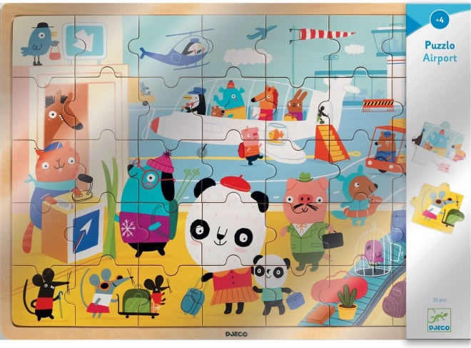Zábavná skladačka pre malých cestovateľov: DJECO drevené puzzle s motívom letiska ponúkne 35 pevných dielikov na drevenej podložke 40 × 28 cm, ideálne od 4 rokov.