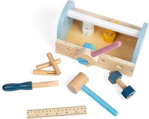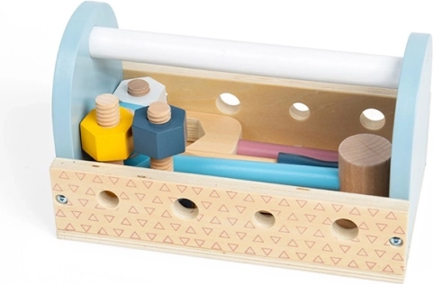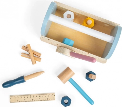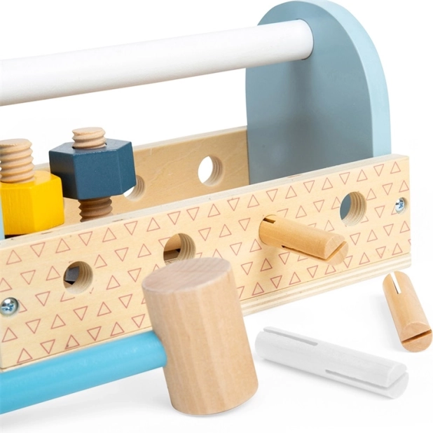 Drevená prepravka s náradím je ideálnou voľbou pre prvé opravárske výpravy. Deti môžu zatĺkať, uťahovať aj merať a pri hre rozvíjajú koordináciu ruka–oko, trpezlivosť a slovnú zásobu. Kompaktné rozmery a praktické držadlo umožnia vziať si sadu kamkoľvek.