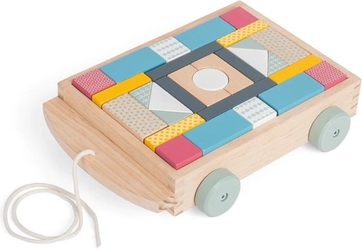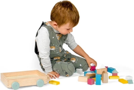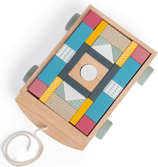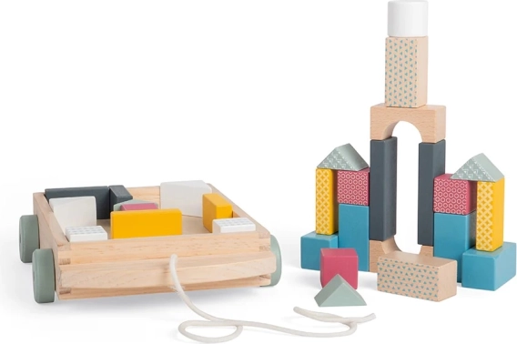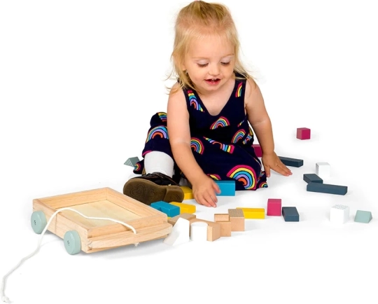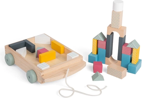 Drevený vozík s 29 farebnými kockami v moderných pastelových odtieňoch je skvelou pomôckou na prvé stavanie, triedenie a učenie. Kocky majú príjemné rozmery, dobre sa držia a ukladajú späť do vozíka, ktorý možno ľahko ťahať za pevný povraz. Hračka napomáha rozvoju rovnováhy, koordinácie aj fantázie.
