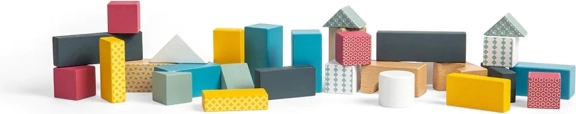 Rôzne tvary a pastelové farby s atraktívnymi vzormi podnecujú fantáziu, učenie farieb a tvarov aj samostatnú hru v štýle Montessori.