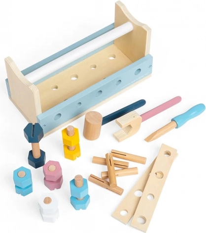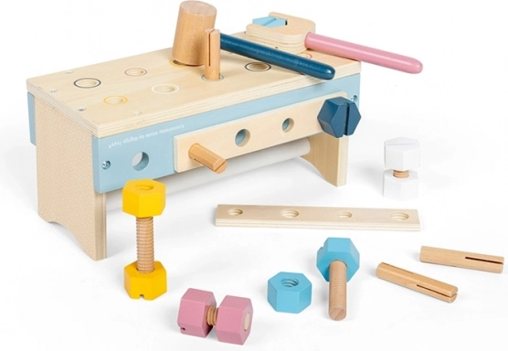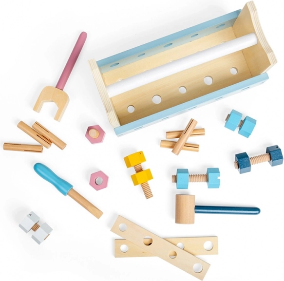Súčasťou je kladivo, skrutkovač, kľúč, pravítko, skrutky a matice – všetko prispôsobené pre malé detské ruky.