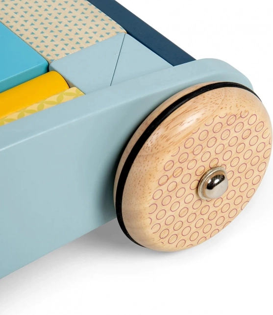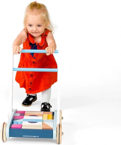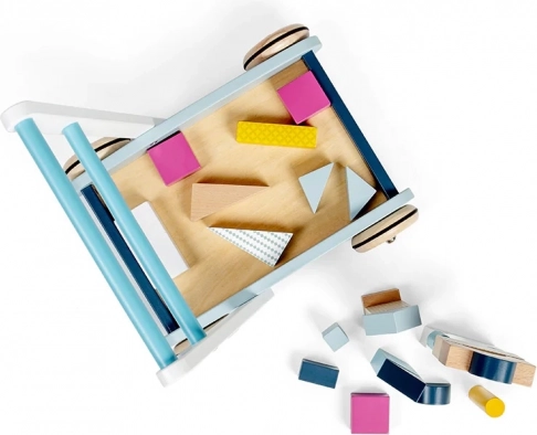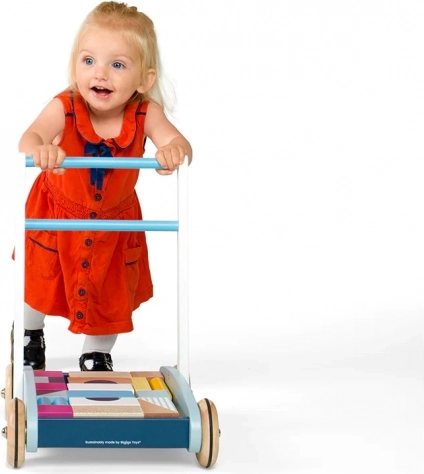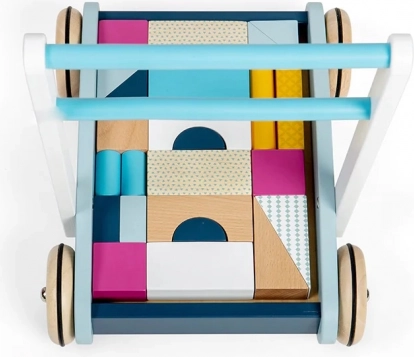 Štýlové drevené chodítko v pastelových farbách podporuje prvé krôčiky aj kreatívnu hru. Je vyrobené z FSC certifikovaného dreva, má stabilnú konštrukciu a ľahko uchopiteľné madlo pre bezpečnú chôdzu. Súčasťou je sada 25 farebných kociek rôznych tvarov a veľkostí pre rozvoj motoriky, koordinácie ruka-oko a spoznávanie farieb a tvarov.