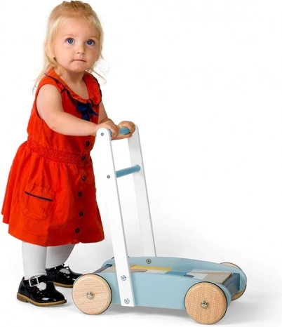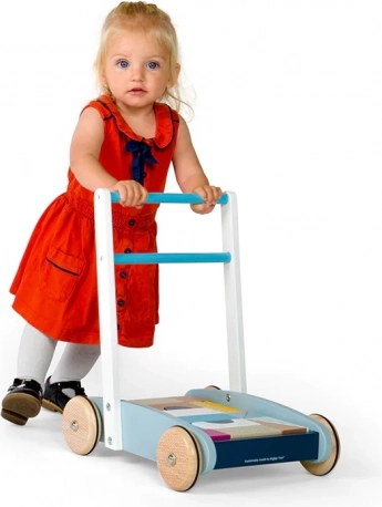 Robustná drevená konštrukcia, dobre uchopiteľné madlo a kolieska s dobrou trakciou pomáhajú deťom chodiť s istotou a bezpečím.