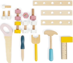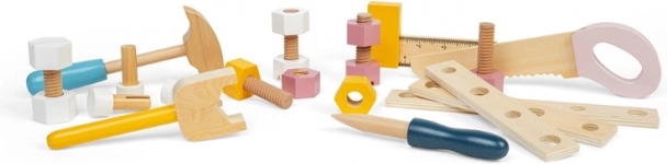 Súčasťou je píla, kľúč, kladivko, skrutkovač, uholník, matice a skrutky – všetko v pastelových farbách a pripravené na tvorenie.