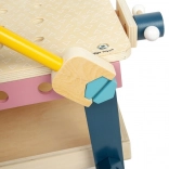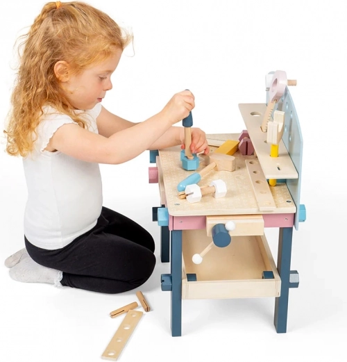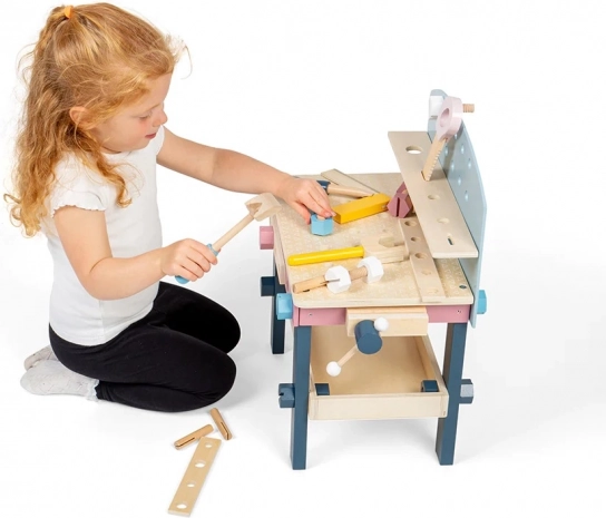 Štýlový drevený pracovný stôl pre malých remeselníkov podporuje jemnú motoriku, koordináciu ruka–oko a kreatívnu hru. Súčasťou je bohatá sada nástrojov – píla, kľúč, kladivko, skrutkovač, uholník a množstvo matíc a skrutiek. Vyrobené z FSC certifikovaného dreva a farbené netoxickými farbami v jemných neutrálnych tónoch, ktoré skvele zapadnú do každej detskej izby.