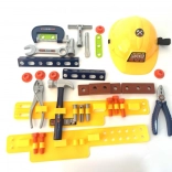 Obsahuje širokú škálu nástrojov ako kladivo, prilbu a skrutkovače, všetko vyrobené z plastu pre bezpečné používanie.