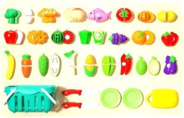 - 30-dielna sada ovocia, zeleniny, rybky, tanierikov, krájacej dosky a nožíkov