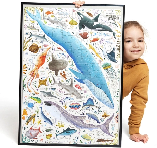 Kto žije v morských hlbinách? Ponorili sme sa do oceánu fantázie a poznatkov o mori a vybrali sme zlomok fascinujúcich tvorov. Skombinovali sme krásne ilustrácie, vzrušujúce námety a pridali veľkú radosť zo skladania. Výsledkom je nádherné dvojstodielne puzzle. Je to skvelý tip na darček, skladačka pre staršie deti aj dospelých a skvelé puzzle na spoločné skladanie.