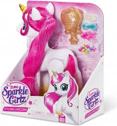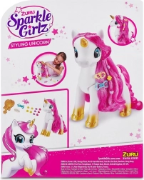 Jednorožec Sparkle Girlz má krásny dizajn a rozkošné prvky, ako sú veľké oči a dlhé, farebné vlasy.