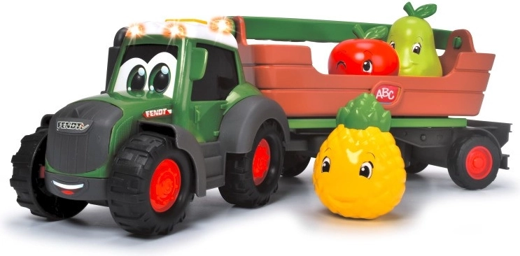 Zábavný traktor s prívesom v tvare košíka. Súčasťou je ovocie: hruška, ananás a jabĺčko, ktoré je obohatené o funkciu hrkálky. Traktor je navyše vybavený svetelnou a zvukovou funkciou. Dĺžka: 30 cm.