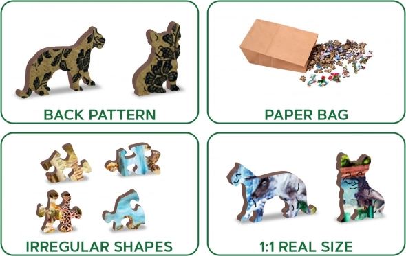Laserom vyrezávané drevené puzzle WOODEN CITY so svojimi špeciálne tvarovanými dielikmi je neuveriteľne zábavné. Časť dielikov je vyrobená v tvare zvierat, stavieb alebo predmetov, ktorých výsledný efekt umocňujú laserom zvýraznené detaily. Tieto dieliky môžu samostatne stáť ako drobné figúrky. Skladanie puzzle s rôznotvarými dielikmi je náročnejšie a predstavuje väčšiu výzvu, než skladanie klasického puzzle. Puzzle je navyše obojstranné, skladať môžete ako podľa obrázka (lícová strana), tak podľa tvaru (rubová strana so vzorom). Značka WOODEN CITY okrem unikátneho konceptu puzzle nezabúda na ekológiu, pri týchto výrobkoch preto nenájdete žiadne plastové obaly.