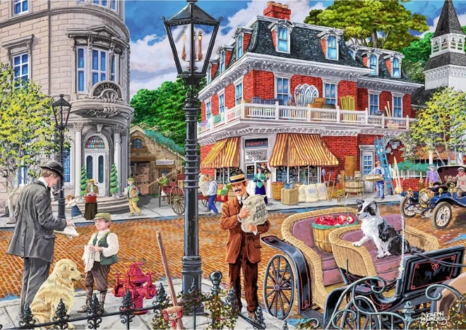 Vibrantná ilustrácia s dobovými domami, povozmi a rušným trhom premení skladanie na vizuálne atraktívny zážitok pre deti aj dospelých.