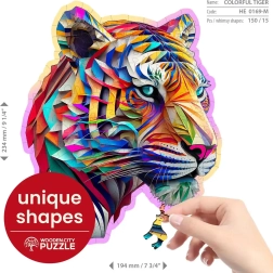 Objavte kúzlo drevených puzzle s modelom Farebný tiger, ktorý nadchne svojím pestrým dizajnom aj kvalitou prevedenia. Laserom vyrezávané dieliky z HDF dosky majú hladké hrany bez triesok a časť z nich je tvarovaná do siluet zvierat s krásne zvýraznenými detailmi. Vďaka rôznorodým tvarom dielikov je skladanie náročnejšie a zábavnejšie ako pri klasických puzzle.