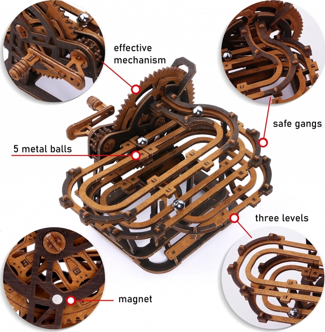 Vychutnajte si fascinujúci zážitok s touto drevenou 3D guličkovou dráhou od Wooden City. Vyrobená z kvalitnej brezovej preglejky, ponúka prepracované detaily a funkčný mechanický model guličiek, ktoré prebiehajú labyrintom poháňaným ručným mechanizmom.