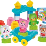 - Koč, 12 mäkkých kociek Clemmy, 2 vežičky, strieška, 4 kocky s postavičkami zvieratiek, ilustrovaná kartónová knižka