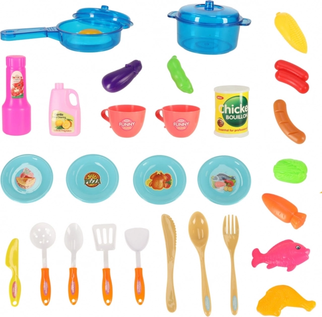 Súprava obsahuje taniere, šálky, hrniec, panvicu a ďalšie pomôcky na kuchárske hranie.