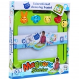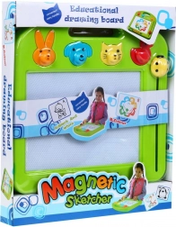 Deti potešia 4 veľké pečiatky zvieratiek (zajac, psík, mačička, káčatko), ktoré obohatia tvorenie. Rysovacie pero na praktickej šnúrke sa nestratí ani v zápale hry. Tabuľa je navrhnutá tak, aby súčasne rozvíjala predstavivosť, sústredenie a koordináciu ruka–oko.