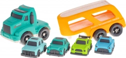 Táto interaktívna sada podporuje jemnú motoriku, predstavivosť aj skorú hru s vozidlami. Farebná odťahovka s odpojiteľnou plošinou ľahko odvezie všetky štyri priložené autíčka. Vďaka svetelným a zvukovým efektom je hra pútavá a realistická, pričom hlasitosť nenaruší domácu pohodu.