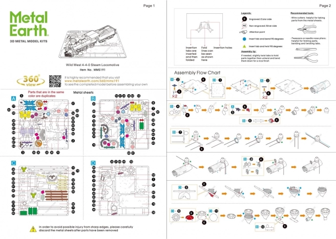 Vzrušujúca výzva, zážitok pri skladaní a oslnivý výsledok – to sú modely METAL EARTH! Model z kolekcie Wild West pre všetkých fanúšikov Divokého západu! Stavba 3D puzzle METAL EARTH si vyžaduje trpezlivosť a šikovné ruky. Výsledok práce však plne vyváži vynaložené úsilie! Miniatúrne repliky sú obzvlášť pôsobivou a pútavou dekoráciou nielen doma, ale aj v kancelárii či v škole. Zo štvorcových plátkov ocele (11 × 11 cm) vám pod rukami vyrastie detailne prepracovaný, fascinujúci model. Autentický vzhľad 3D puzzle METAL EARTH je dosiahnutý vďaka detailnému laserovému gravírovaniu. Balenie obsahuje 4 oceľové plátky a návod na zloženie. Náradie nie je súčasťou balenia. PRACOVNÝ POSTUP: Jednotlivé diely vyberte z kovových plátkov, v prípade potreby použite malé štípacie nožnice (nie sú súčasťou). Dieliky sa spájajú pomocou zámkov tvorených úchytom (jazýčkom) a otvorom. Jazýček ohnite pomocou malých tenkých klieští (nie sú súčasťou) a postupne spojte všetky zámky, až vznikne veľmi realistický majstrovský kúsok! Odporúčaný vek: od 14 rokov.