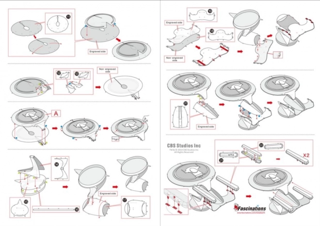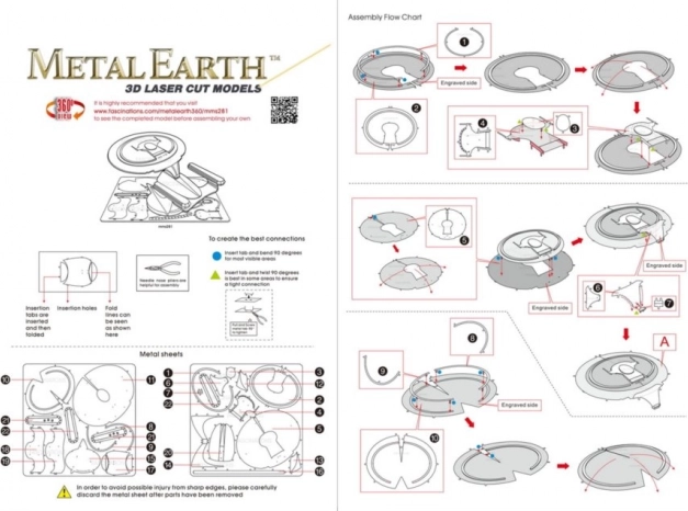 Jednotlivé diely vyberte z kovových plátkov, v prípade potreby použite malé štípacie nožničky (nie sú súčasťou). Dieliky sa spájajú pomocou zámkov tvorených úchytom (zobáčikom) a otvorom. Zobáčik ohnite pomocou malých tenkých klieští (nie sú súčasťou) a postupne spojte všetky zámky, až vznikne veľmi realistický majstrovský kúsok!