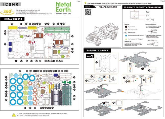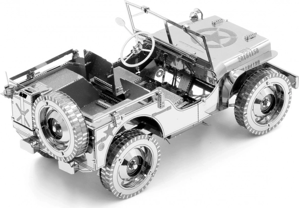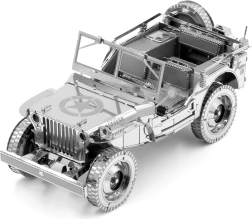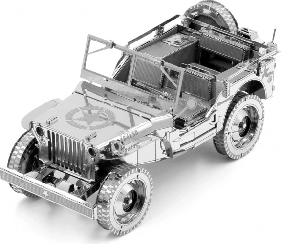 Vzrušujúca výzva, zážitok pri skladaní a oslnivý výsledok – to sú modely METAL EARTH! Model z prémiovej rady ICONX v exkluzívnom darčekovom balení vás očarí ešte dokonalejším spracovaním detailov! Stavba 3D puzzle METAL EARTH ICONX si vyžaduje trpezlivosť a šikovné ruky. Výsledok práce však plne vyváži vynaložené úsilie! Miniatúrne repliky sú obzvlášť pôsobivou a pútavou dekoráciou nielen doma, ale aj v kancelárii či v škole. Z obdĺžnikových plieškov ocele (21 x 11 cm) s časťami svetových monumentov, slávnych dopravných prostriedkov, hudobných nástrojov či zvierat vám pod rukami vyrastú detailne prepracované, fascinujúce modely. Autentický vzhľad 3D puzzle METAL EARTH ICONX je dosiahnutý vďaka detailnému laserovému gravírovaniu. Balenie obsahuje 2 oceľové pliešky, pinzetu a návod na zloženie. Náradie nie je súčasťou balenia. PRACOVNÝ POSTUP: Jednotlivé diely vyberte z kovových plieškov, v prípade potreby použite malé štikacie nožnice (nie sú súčasťou). Diely sa spájajú k sebe pomocou zámkov tvorených úchytom (jazýčkom) a otvorom. Jazýček ohnite pomocou malých tenkých klieští (nie sú súčasťou) a postupne spojte všetky zámky, až vznikne veľmi realistický majstrovský kúsok! Odporúčaný vek: od 14 rokov. Jeep Willys MB bol americký ľahký úžitkový voz, ktorý vznikol v dobe druhej svetovej vojny. Jeho názov jeep (slovensky: džíp) sa stal synonymom pre terénny automobil na celom svete. Tento legendárny voz bol azda najznámejším vozidlom druhej svetovej vojny. Viac na Wikipédii Rozmer zloženého puzzle cca 9,7 x 3,8 x 4 cm