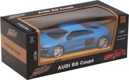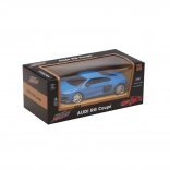 Modré Audi R8 Coupé je zabalené v čiernej krabici s priehľadným oknom, umožňuje detailný pohľad na model.