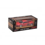 Červené diaľkovo riadené auto pripomína luxusný model Audi R8 Coupé, so striebornými kolesami a čiernym diaľkovým ovládaním.