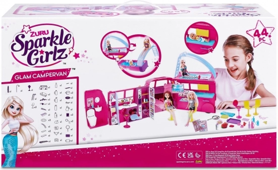 Na streche čaká bazén so šmýkačkou na večerné pozorovanie hviezd, zatiaľ čo vonkajší gril premení každú zastávku na piknik. Sedadlá vodiča a spolujazdca možno sklopiť, aby si všetci mohli sadnúť k stolu. Nezabudnite karavan dozdobiť samolepkami Sparkle Girlz a jazdiť naozaj štýlovo. Bábika nie je súčasťou balenia. Upozornenie: Nebezpečenstvo udusenia – malé časti. Nevhodné pre deti do 3 rokov. Odporúčaný vek 3+.