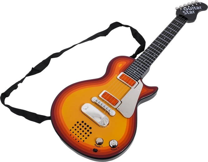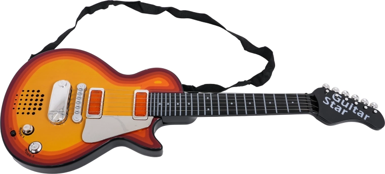 Vďaka odľahčenej konštrukcii a pohodlnému popruhu je nástroj ideálny pre deti od 3 rokov. Gitara má CE certifikáciu a je tak bezpečnou a zábavnou voľbou pre prvý kontakt s hudbou. Napájanie zabezpečujú batérie 3× AA (nie sú súčasťou balenia).