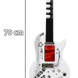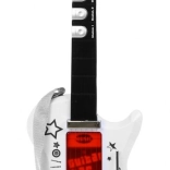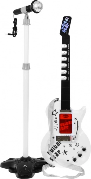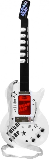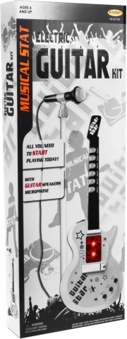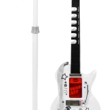 | | Jedinečná elektrická gitara pre budúcich gitaristov spolu s mikrofónom v balení. Gitara je mimoriadne inšpiratívny hudobný nástroj zo skupiny brnkacích strún, ktorý hrá mimoriadne dôležitú úlohu v blues, country, flamencu, rockovej hudbe a v mnohých formách pop music. Dieťa už v prvých rokoch života prejavuje záujem o hranie sa s hračkami, tancuje, spieva, skúša hrať na jednoduché nástroje. Prítomnosť hudby vo vývine dieťaťa má jednoznačne pozitívny vplyv. Talent odhalený v tak ranom štádiu má šancu sa v budúcnosti výrazne rozvinúť, preto by tento okamih nemal byť premeškaný. Ak sa vaše dieťa pozerá na gitaristov s nepredstaviteľnou radosťou, predstiera, že hrá na imaginárnu gitaru a má zmysel pre rytmus – potom môže mať talent na hru na akúkoľvek gitaru. Hračka je vybavená 6 kovovými strunami, 3 gitarovými tónmi, 7 melódiami a 12 krátkymi sólami. | Obsah sady | - gitara s nastaviteľným popruhom (napájaná 3 batériami typu AA 3 × 1,5 V – nie sú súčasťou balenia), - mikrofón na zosilnenie hlasu, - nastaviteľný statív (2 úrovne), - nastavenie úrovne mikrofónu, - kábel pre MP3, |