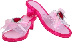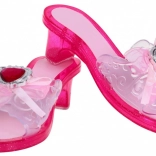 Pár ružových lodičiek s vysokým podpätkom s veľkými červenými srdcovými šperkami a jemnými ružovými stuhami. Navrhnuté na prezliekanie a hru, dokonale imitujú princeznovskú obuv.