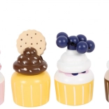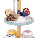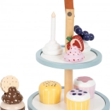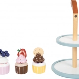 Štýlový dvojposchodový stojan na muffiny od small foot premení každú detskú kuchynku na malú cukráreň. Ponúka 4 muffiny s vymeniteľnými polevami, magnetické spojenie dielov pre ľahké kombinovanie a moderné škandinávske farby. Nechýba sviečka, sušienka ani jahodové a čučoriedkové ozdoby – ideálne na fantazijnú hru a rozvoj jemnej motoriky.