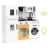 Táto štýlová detská kuchynka v bielo‑drevenom dizajne verne napodobňuje skutočnú kuchyňu. Vďaka svietiacim platničkám a zvukom varenia po stlačení červených tlačidiel je hra ešte pútavejšia. Otváracie dvierka na chladničke, rúre, mikrovlnke aj práčke, otáčacie gombíky sporáka a „dávkovač vody“ s bublajúcim zvukom podporia realistické scenáre hry.