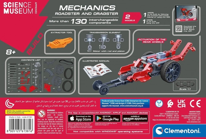 Táto stavebnica z rady CLEMENTONI SCIENCE & PLAY uvedie deti do sveta mechaniky a inžinierstva. Postavte svieži roadster alebo výkonný dragster a spoznajte, ako fungujú prevody, ojnice, piesty a prevodové moduly. Vďaka presnému prepojeniu dielikov si užijete robustnú konštrukciu aj plynulý pohyb modelov.