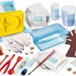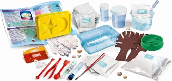 Obsah sady: forma, podklad pre papierový model, špeciálne savé papiere, ochranné rukavice, nádobka s uzáverom 100 ml, nádobka s uzáverom 50 ml, pinzeta, špachtľa, pipeta, farbivá, plastová miska, nádobka na kryštály, vzorky hornín, štetec, bezpečnostná poistka k skúmavkám, skúmavka s viečkom, vrecúška so síranom hlinitým a draselným, vrecúško so sadrou, vrecúško s dihydrogenfosforečnanom draselným, vrecúško s dihydrogenortofosforečnanom amónnym, skúmavka s hlinitanom stroncia, ilustrovaná príručka (CZ, SK, PL, HU).