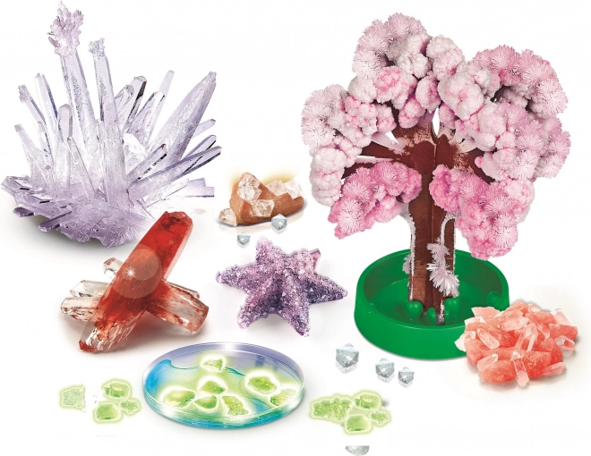 Vedecká sada Science&Play na vytváranie fosforeskujúcich kryštálov. Objavte, ako vytvoriť priesvitné, farebné, fluorescenčné a lesklé kryštály.