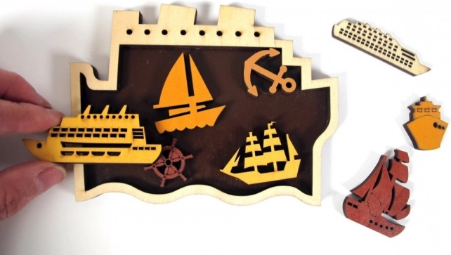 Farebné drevené dieliky v tvare lodí, kotvy či kormidla poskladajte do presne vymedzeného priestoru. Skvelé na tréning logiky a jemnej motoriky.