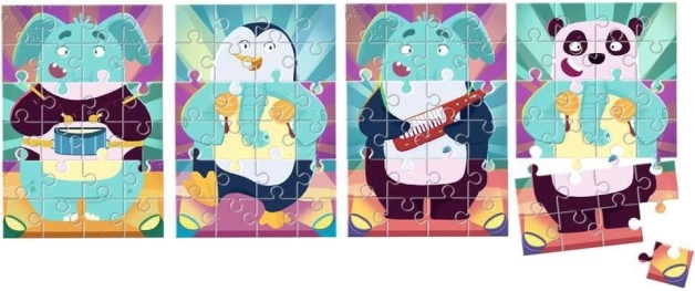 Užite si šikovné skladanie aj zábavné miešanie dielikov: v balení nájdete 3 detské puzzle, každé s 24 dielikmi. Dieliky možno medzi všetkými tromi obrázkami ľubovoľne kombinovať a vytvárať tak vtipné zvieratká. Rozmer zloženého obrázka je cca 18 × 26 cm.