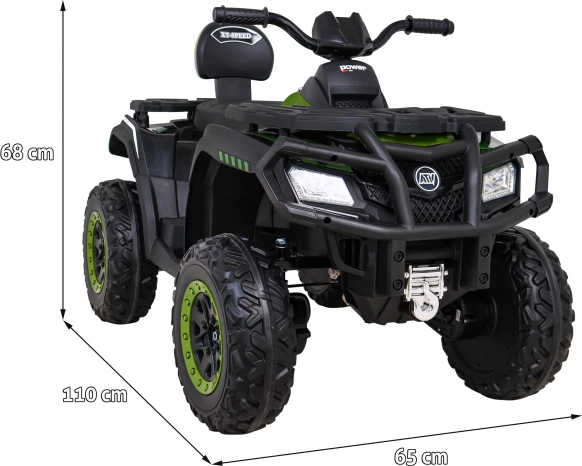 Táto štvorkolka je vybavená možnosťou pomalého štartu, dvojrýchlostných režimov a voľby spätného chodu, čo zaručuje pohodlnú a bezpečnú jazdu. LED predné svetlá a ďalšie detailné prvky zaisťujú reálny vzhľad aj za šera.