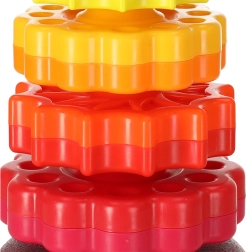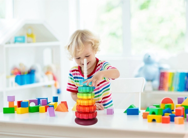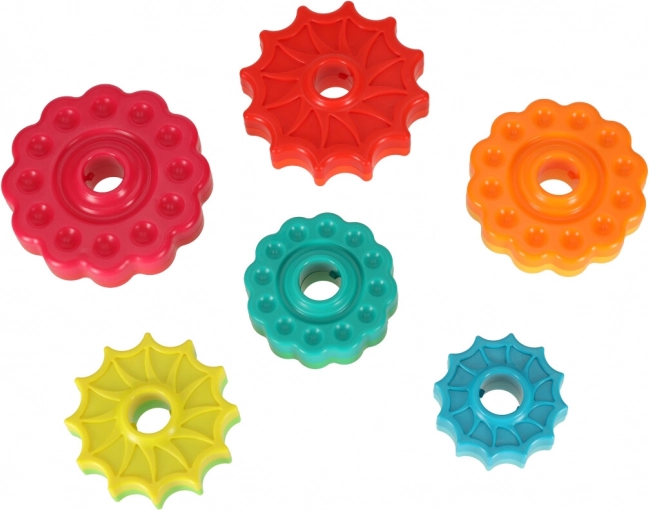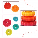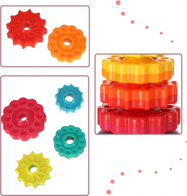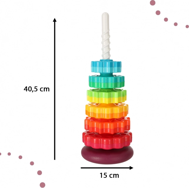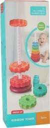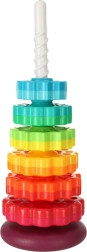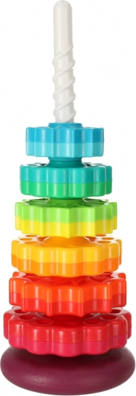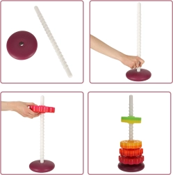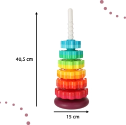 Táto farebná špirálová veža spája pohyb, farby a textúry do jedného zábavného celku. Deti nasadzujú ozubené krúžky na plastovú špirálovú tyč, sledujú ich rotáciu a vnímajú jemné zvuky pri skĺzavaní. Hra podporuje koordináciu oko–ruka, príčinu a následok aj triedenie podľa veľkosti a farieb.