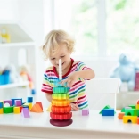 Veľké, ľahko uchopiteľné diely trénujú úchop, prekladanie a skladanie. Sýte farby motivujú k triedeniu podľa veľkosti aj odtieňov, čím podporujú logiku, sústredenie a kreativitu.