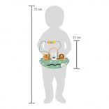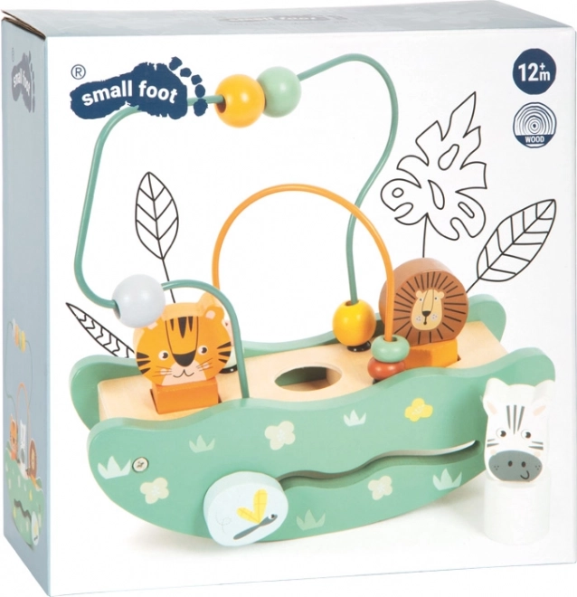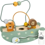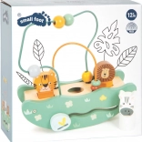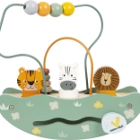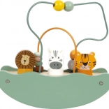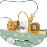 Drevená hračka s motívom safari zahŕňa farebné korálky a zvieracie figúrky leva, tigra a zebry pre hravé učenie.